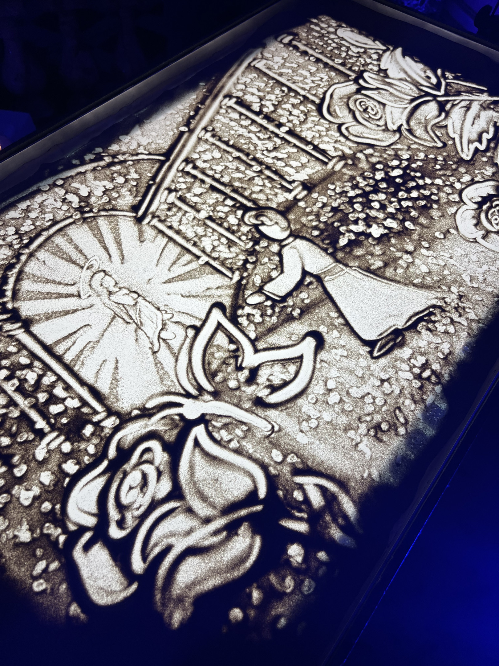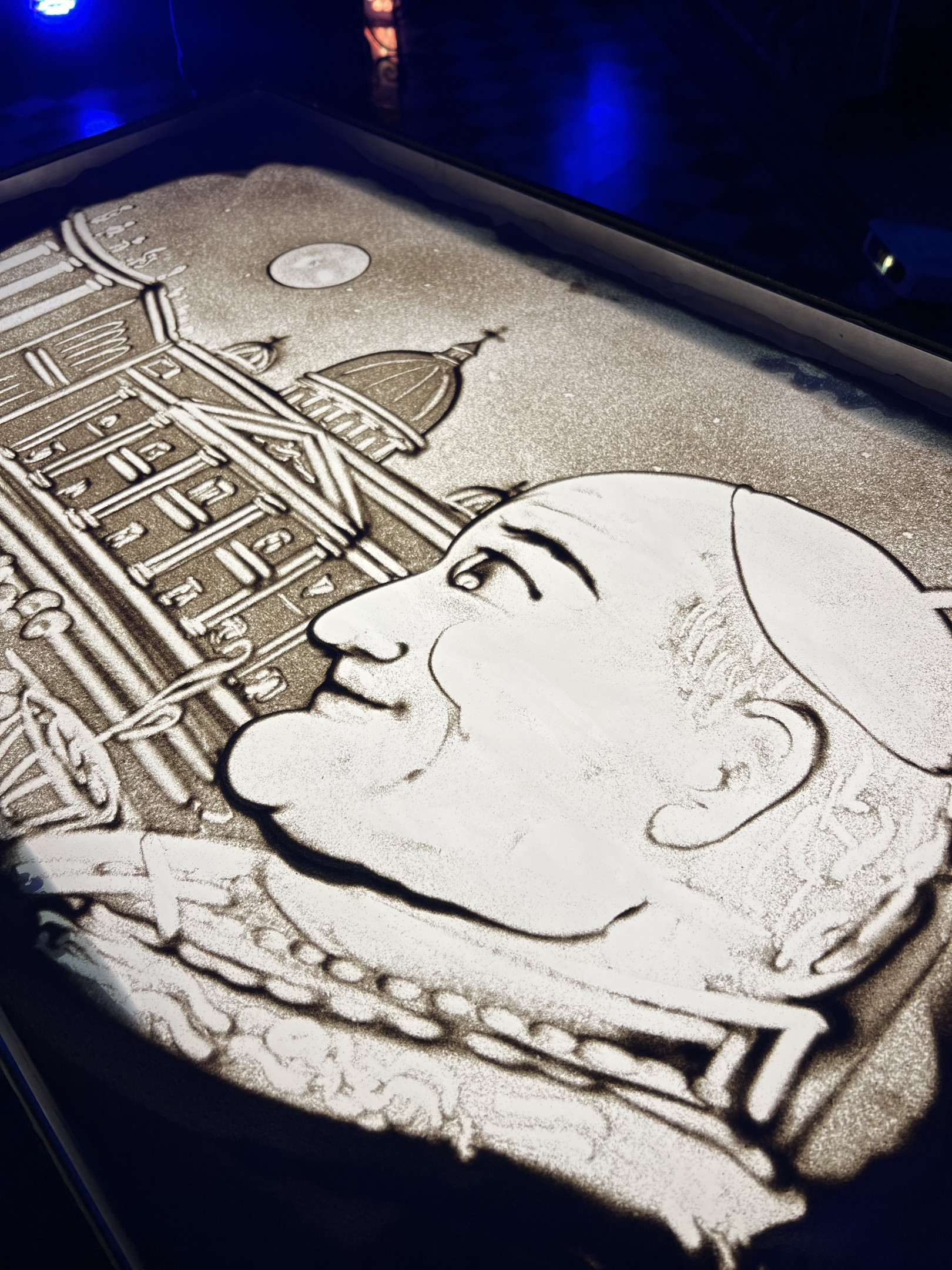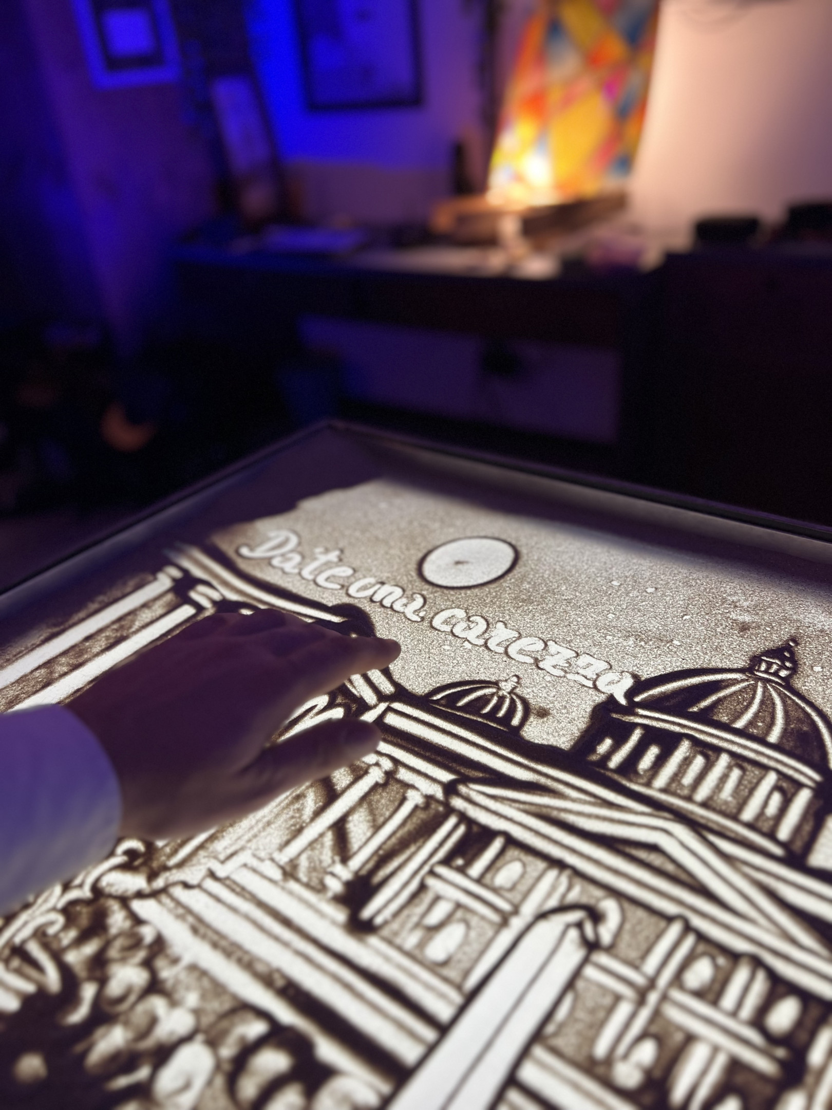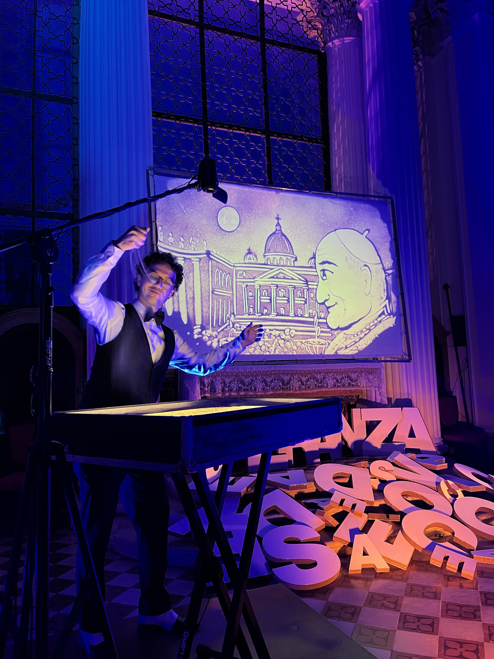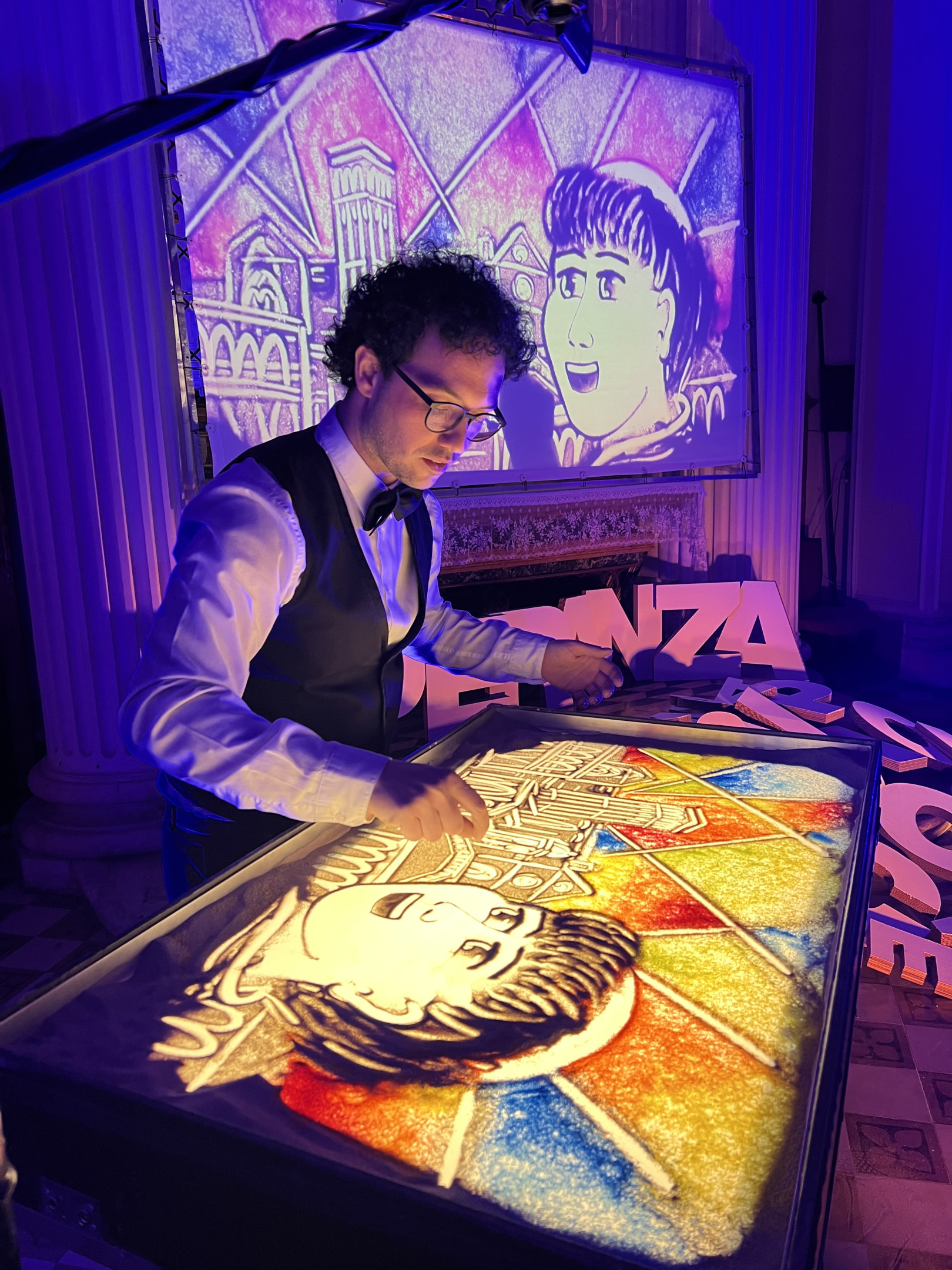 Ma non ci fermiamo qui. Comprendiamo il desiderio di un messaggio unico e personalizzato. Per questo, offriamo la possibilità di creare spettacoli di sand art su misura, plasmando la sabbia per raccontare storie specifiche, celebrare figure importanti o approfondire temi a voi cari.